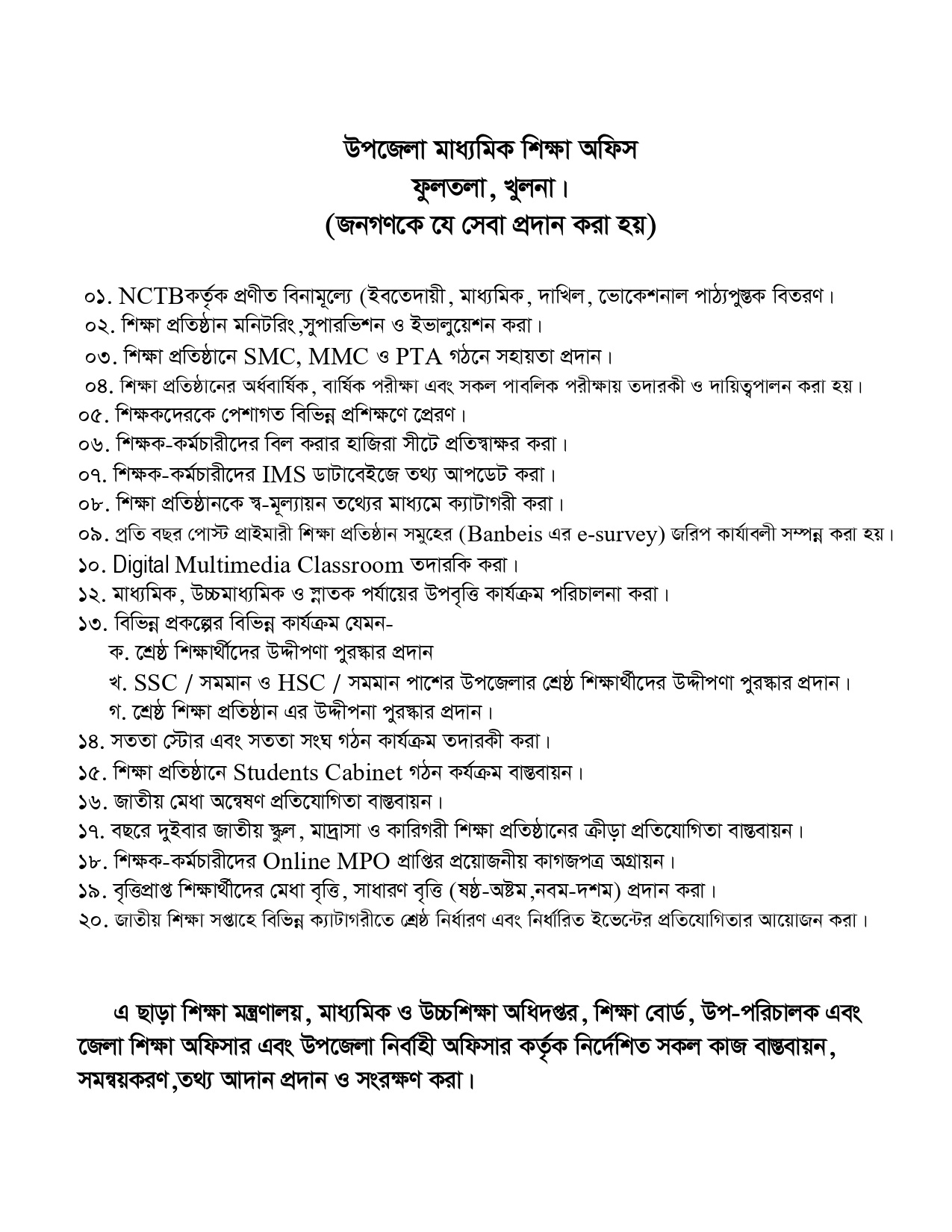 উপজেলা মাধ্যমিক শিক্ষা অফিস , ফুলতলা , খুলনা থেকে যেসব সেবা প্রদান করা হয় তার একটা তালিকা প্রকাশ করা হলো।